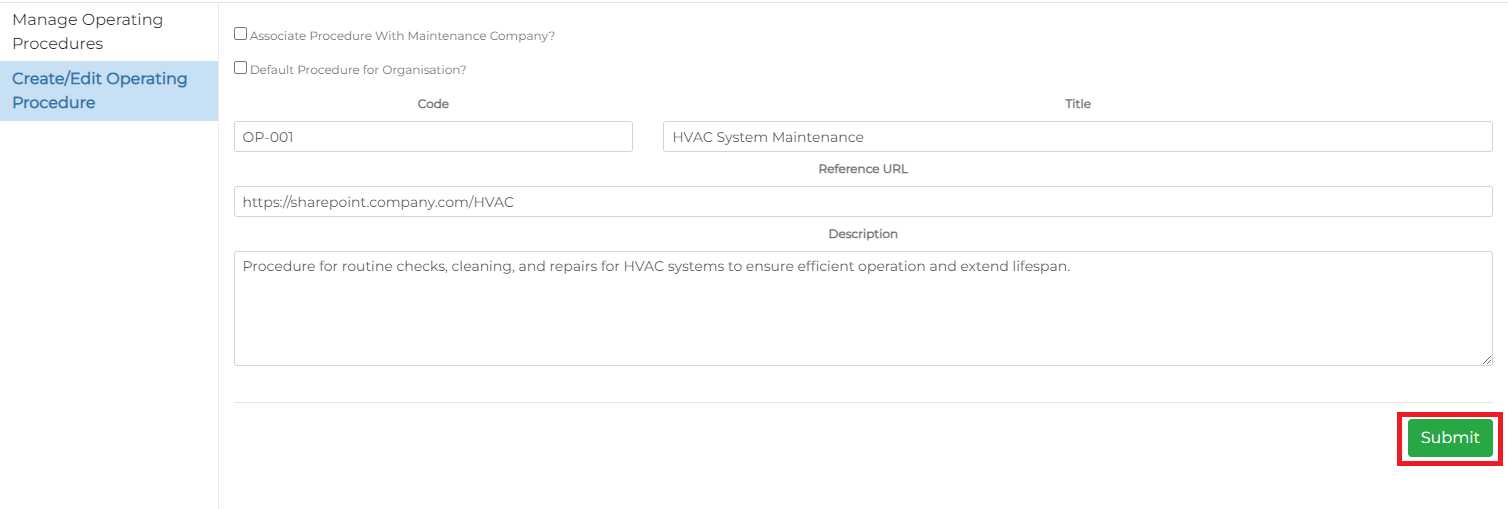 Operating Procedures are managed at an organisational level, meaning any procedures you configure here will be accessible organisation-wide.