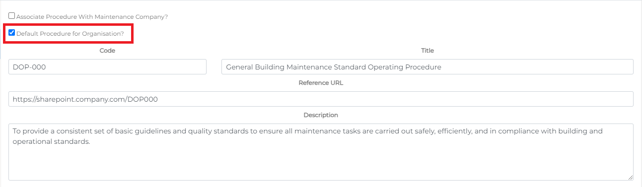 - In the add/edit form, select the Default Procedure for Organisation checkbox.
