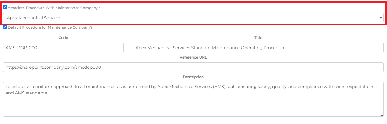 - Select the Associate Procedure with Maintenance Company checkbox.